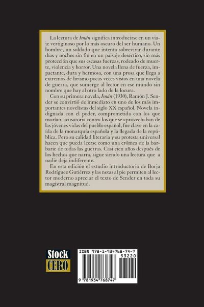 To read Iman (1930) by Ramon J. Sender is to sail into a vertiginous trip within the darkest aspects of the human being. A man, a soldier striving to survive along endless days and nights in a desert landscape, without further protection besides his scarce strengths, surrounded by death, violence, horror. A shockingly compelling novel, both harsh and beautiful, written in a prose that attains lyricism heights seldom seen in war novels, that has the power to immerse the reader into the nameless world that lies beyond the madness frontier. With this, his first novel Ramon J. Sender (Spain 1901- USA 1982) immediately became one of the most important XX Century Spanish novelists. Iman, a novel full of aggravation provoked by the senseless powers that ruled Spain, sympathetic towards those who died, accuser against those who took advantage of the young lives of the Spanish people, played a key role in the Spanish monarchy fall and the subsequent arrival of the Republic. But its literary and universal claim values make it stand as the chronicle of the unleashed barbarism inherent to each and every war. Almost a century after the narrated episodes it still makes for a reading that leaves no room for indifference. In this edition the introductory study by Borja Rodríguez Gutiérrez and the footnotes allow the modern reader to grasp and enjoy the Sender text in its full masterpiece magnitude.
