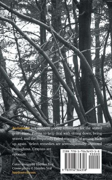 Imbalance is a modern poetry collection for the seated generation. Poems to help deal with sitting down, being seated, and the frequently failed attempts of getting back up again. Select remedies are serendipitously scattered throughout. Crayons are optional.