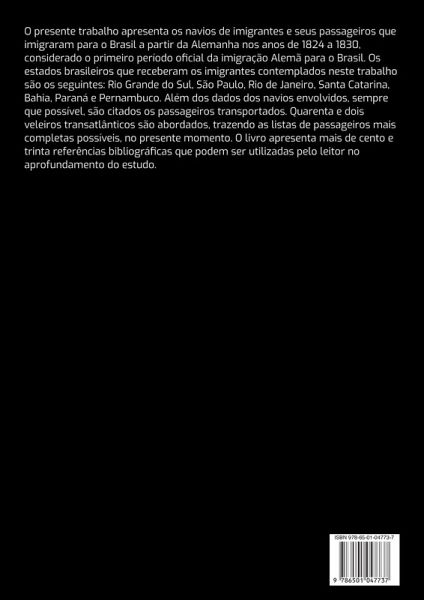 O presente trabalho apresenta os navios de imigrantes e seus passageiros que imigraram para o Brasil a partir da Alemanha nos anos de 1824 a 1830, con