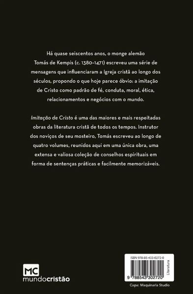 Imitação de Cristo é uma das maiores e mais respeitadas obras da literatura cristã de todos os tempos. Instrutor espiritual dos noviços de seu mosteiro, Tomás escreveu ao longo de quatro volumes, reunidos aqui em uma única obra, uma extensa e valiosa coleção de conselhos práticos em forma de sentenças práticas e facilmente memorizáveis. ¿"Um dos mais belos frutos da piedade mística medieval, esta obra destaca a profunda comunhão com o Salvador como fundamento da vida e do trabalho cristão. Embora escrita por um religioso para os religiosos que estavam sob seus cuidados espirituais, sua espiritualidade bíblica e sua ênfase no cultivo da interioridade são relevantes para cristãos de todos os tempos." - Alderi Souza de Matos, Th.D