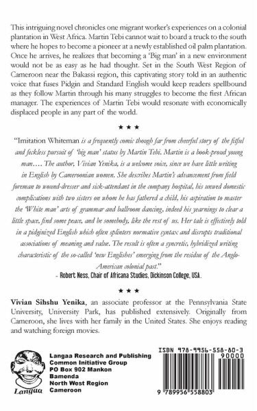 This intriguing novel chronicles one migrant worker's experiences on a colonial plantation in West Africa. Martin Tebi cannot wait to board a truck to the south where he hopes to become a pioneer at a newly established oil palm plantation. Once he arrives, he realizes that becoming a 'Big man' in a new environment would not be as easy as he had thought. Set in the South West Region of Cameroon near the Bakassi region, this captivating story told in an authentic voice that fuses Pidgin and Standard English would keep readers spellbound as they follow Martin through his many struggles to become the first African manager. The experiences of Martin Tebi would resonate with economically displaced people in any part of the world.