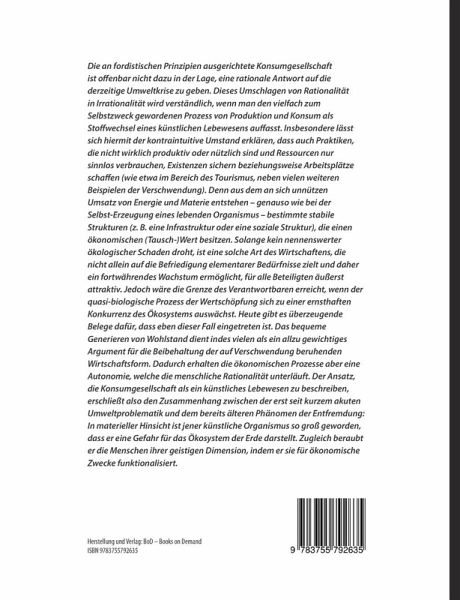 Die an fordistischen Prinzipien ausgerichtete Konsumgesellschaft ist offenbar nicht dazu in der Lage, eine rationale Antwort auf die derzeitige Umweltkrise zu geben. Dieses Umschlagen von Rationalität in Irrationalität wird verständlich, wenn man den Prozess von Produktion und Konsum als Stoffwechsel eines künstlichen Lebewesens auffasst. Es kann nämlich auch ein vollkommen unnützer Umsatz von Energie und Materie Existenzen sichern beziehungsweise Arbeitsplätze schaffen (wie etwa im Bereich des Tourismus, neben vielen weiteren Beispielen der Verschwendung). Eine solche Art des Wirtschaftens, die nicht allein auf die Befriedigung elementarer Bedürfnisse zielt, erscheint sogar besonders attraktiv, da sie ein fortwährendes Wachstum ermöglicht. Somit besteht für alle Beteiligten eine starke Motivation, das ökonomische System - in Analogie zu einem lebenden Organismus - als Selbstzweck zu etablieren und gegen jeden Versuch einer Beschränkung zu verteidigen. Jedoch wäre die Grenze des Verantwortbaren erreicht, wenn der quasi-biologische Prozess der Wertschöpfung den Bestand des natürlichen Ökosystems gefährdet. Heute gibt es überzeugende Belege dafür, dass eben dieser Fall eingetreten ist. Das bequeme Generieren von Wohlstand dient indes noch allzu vielen als Argument für die Beibehaltung der auf Verschwendung beruhenden Wirtschaftsform. Der Ansatz, die Konsumgesellschaft als ein künstliches Lebewesen zu beschreiben, erschließt also den Zusammenhang zwischen der erst seit kurzem akuten Umweltproblematik und dem bereits älteren Phänomen der Entfremdung: In materieller Hinsicht ist jener künstliche Organismus so groß geworden, dass er eine Bedrohung für das Ökosystem darstellt. Zugleich beraubt er die Menschen ihrer geistigen Dimension, indem er sie für ökonomische Zwecke funktionalisiert. (Überarbeitete und neu gestaltete Ausgabe, 05.04.2022)