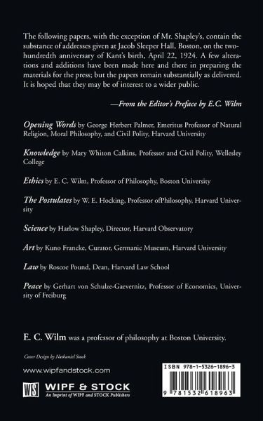The following papers, with the exception of Mr. Shapley's, contain the substance of addresses given at Jacob Sleeper Hall, Boston, on the two-hundredth anniversary of Kant's birth, April 22, 1924. A few alterations and additions have been made here and there in preparing the materials for the press; but the papers remain substantially as delivered. It is hoped that they may be of interest to a wider public. --From the Editor's Preface by E.C. Wilm Opening Words by George Herbert Palmer, Emeritus Professor of Natural Religion, Moral Philosophy, and Civil Polity, Harvard University Knowledge by Mary Whiton Calkins, Professor and Civil Polity, Wellesley College Ethics by E.C. Wilm, Professor of Philosophy, Boston University The Postulates by W.E. Hocking, Professor of Philosophy, Harvard University Science by Harlow Shapley, Director, Harvard Observatory Art by Kuno Francke, Curator, Germanic Museum, Harvard University Law by Roscoe Pound, Dean, Harvard Law School Peace by Gerhart von Schulze-Gaevernitz, Professor of Economics, University of Freiburg