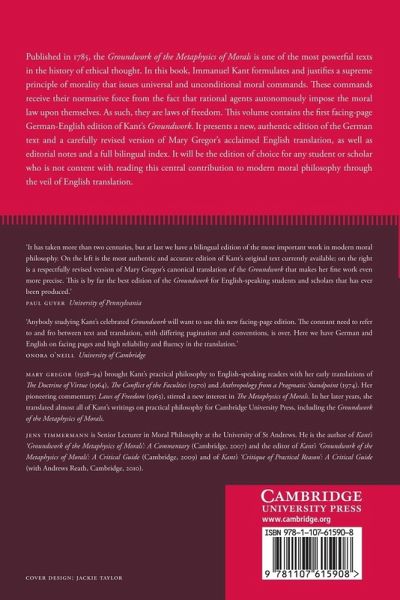 This volume contains the first facing-page German-English edition of Kant's Groundwork of the Metaphysics of Morals. It presents an authentic edition of the German text and a carefully revised version of Mary Gregor's acclaimed English translation, as well as editorial notes and a full bilingual index.