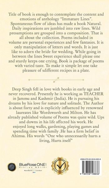 Deep Singh fell in love with books in early age and never recovered. Presently he is working as TEACHER in Jammu and Kashmir (India). He is pursuing his dreams by his love for nature and solitude. The Author is about forty and is explicitly influenced by renowned laureates like Wordsworth and Milton. He ras already published volume of Poems was quite wild. Ups and downs in his life affected his work. He enjoyed long walks, gardening, playing games and spending time with family He has a firm belief in Ahimsa. His words "One who unnecessarily hurts a living, Hurts itself