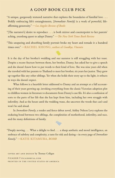 A goop Book Club Selection and Best Book of the Year "This unsparing and absorbing family portrait broke my heart and remade it a hundred times over."-Rachel Khong, author of Goodbye, Vitamin It is the day of her brother's wedding and our narrator is still struggling with her toast. Despite a recent fracture between them, her brother, Danny, has asked her to give a speech and she doesn't know where to begin, how to put words to their kind of love. She was nine years old when she traveled with her parents to Thailand to meet her brother, six years her junior. They grew up together like any other siblings, and shared a bucolic childhood in Northern California. Yet when she holds their story up to the light, it refracts in ways she doesn't expect. What follows is a heartfelt letter addressed to Danny and an attempt at a full accounting of their years growing up, invoking everything from the classic Victorian adoption plot to childless women in literature to documents from Danny's case file. It's also a confession of sorts to the parts of her life that she has kept from him, including her own struggle with infertility. And as the hours until the wedding wane, she uncovers the words that can't and won't be said aloud. In Immediate Family, a tender and fierce debut novel, Ashley Nelson Levy explores the enduring bond between two siblings and the complexities of motherhood, infertility, race, and the many definitions of family.