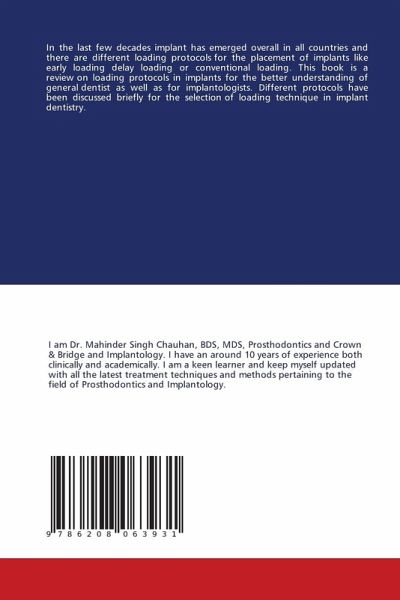 In the last few decades implant has emerged overall in all countries and there are different loading protocols for the placement of implants like early loading delay loading or conventional loading. This book is a review on loading protocols in implants for the better understanding of general dentist as well as for implantologists. Different protocols have been discussed briefly for the selection of loading technique in implant dentistry.
