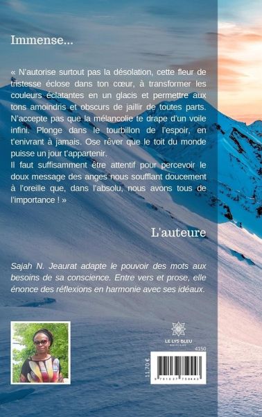 « N¿autorise surtout pas la désolation, cette fleur de tristesse éclose dans ton c¿ur, à transformer les couleurs éclatantes en un glacis et permettre aux tons amoindris et obscurs de jaillir de toutes parts. N¿accepte pas que la mélancolie te drape d¿un voile infini. Plonge dans le tourbillon de l¿espoir, en t¿enivrant à jamais. Ose rêver que le toit du monde puisse un jour t¿appartenir. Il faut suffisamment être attentif pour percevoir le doux message des anges nous soufflant doucement à l¿oreille que, dans l¿absolu, nous avons tous de l¿importance ! »
