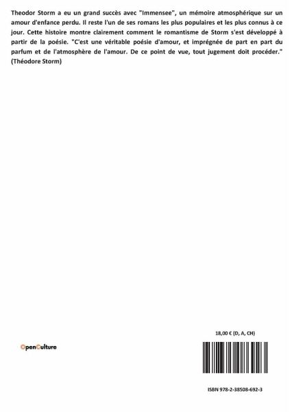 Immensee (1849 and 1851) is a novella by German author Theodor Storm. It was the work that made him famous and remains to this day one of his most widely read. Immensee was first published in Biernatzki¿s Volksbuch in December 1849 when the author was well known regionally, but with the revised edition 1851, he became famous all over Germany and then the world. By the time of his death in 1888, it saw 33 editions in 17 languages. Storm revised it using some comments from his friend Tyco Mommsen and republished it in 1851 in Sommergeschichten und Lieder and finally as a single work edition in 1852. The first English translation appeared in 1858 in Henry Colburn¿s New Monthly Magazine and Literary Journal with a second version first appearing in the USA in 1863. It was Storm's best selling work and remains to this day one of his most widely read, along with The Rider on the White Horse and Pole Poppenspäler.