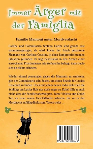 Familie Mantoni unter MordverdachtCarlina und Commissario Stefano Garini sind gerade erst zusammengezogen, da wird Lucio, der frisch gebackene Ehemann von Carlinas Cousine, in einer kompromittierenden Situation gefunden: Er liegt bewusstlos in den Armen einer erstochenen Prostituierten. Als Stefano ihn befragt, kann Lucio sich an nichts erinnern.Wieder einmal gezwungen, gegen die Mantonis zu ermitteln, gibt der Commissario sein Bestes, um einen Beweis für Lucios Unschuld zu finden. Doch mit jedem neuen Indiz zieht sich die Schlinge um Lucios Hals nur noch enger zu. Dabei hilft es auch nicht, dass die Familienoberhäupter, Tante Violetta und Onkel Teo, an einer neuen Geschäftsidee arbeiten, die sie in der Mordnacht zufällig direkt zum Tatort treibt ...