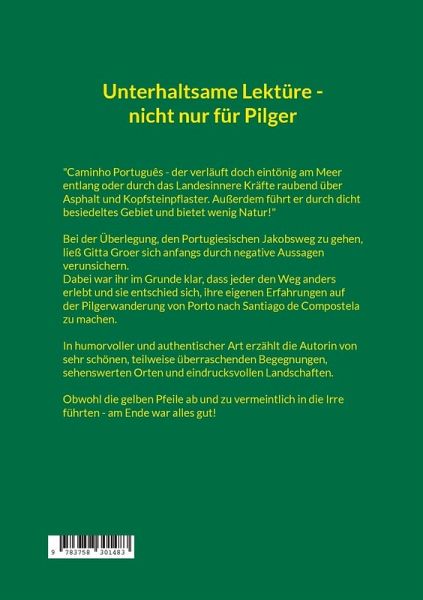 Bei der Überlegung den Portugiesischen Jakobsweg zu gehen, ließ Gitta Groer sich anfangs durch negative Berichte verunsichern. Im Grunde war der Autorin jedoch klar, dass jeder den Weg anders erlebt und sie entschied sich ihre eigenen Erfahrungen auf der Pilgerwanderung von Porto nach Santiago de Compostela zu machen. In humorvoller und authentischer Art erzählt Gitta Groer von wundervollen, teilweise überraschenden Begegnungen, sehenswerten Orten und eindrucksvollen Landschaften. Obwohl die gelben Pfeile ab und zu vermeintlich in die Irre führten - am Ende war alles gut.