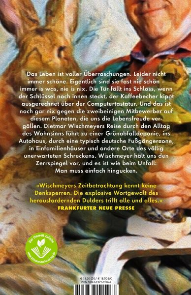 Das seltsamste Land, in dem wir leben, nennt sich «Alltag». Was wir für die Normalität halten, ist ein Cocktail aus Wahnsinn und Marmeladenbroten, die immer mit der falschen Seite am Boden aufschlagen. Dietmar Wischmeyer nimmt uns mit in eine Welt der alltäglichen Skurrilitäten. Wir begleiten ihn zur Grünabfalldeponie, sind dabei, wie ein ostelbischer Spediteur bei der Lieferung einer Waschmaschine durchdreht, oder leiden mit ihm an der Bratwurstbude. Man erfährt, wieso hinter Dortmund das Elend anfängt und warum jede Fußgängerzone zwischen Flens- und Freiburg nur eine Variation über Asia-Imbisse und Matratzendiscounter ist. Hat man sich Wischmeyers Blick des staunenden Fremden erst einmal zu eigen gemacht, dann erscheint uns dieses Alltagsdeutschland wie eine exotische Welt. War Wischmeyers vorheriges Buch «Als Mutti unser Kanzler war» die theoretische Abrechnung mit dem Merkelozän, dann ist dieses Buch die hautnahe Begegnung mit den zweibeinigen Folgeschäden.