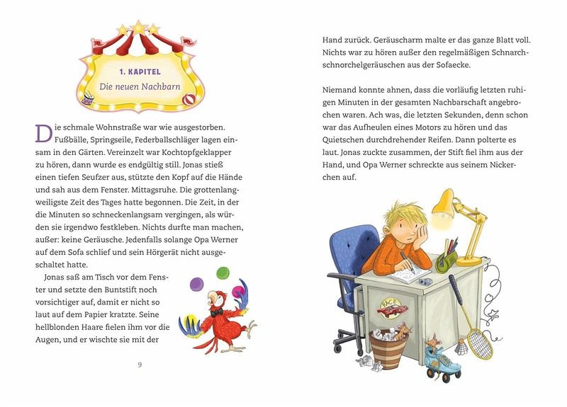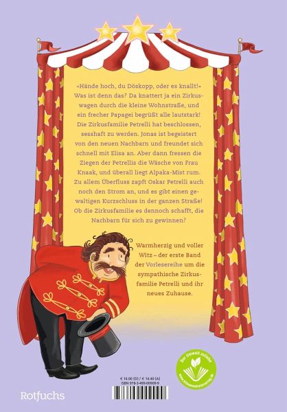 «Hände hoch, du Döskopp, oder es knallt!» Die neuen Nachbarn kündigen sich mit einigem Radau an! Erst knattert ein Zirkuswagen durch die kleine, gemütliche Wohnstraße, und ein bunter Papagei begrüßt alle lautstark mit frechen Sprüchen. Dann springt und rollt und hüpft eine lebhafte Familie heraus: Die Petrellis haben beschlossen, sesshaft zu werden! Jonas findet das toll und freundet sich schnell mit der gleichaltrigen Elisa an. Bei den Petrellis ist einfach immer etwas los! Zum Fensterputzen machen sie eine Pyramide, und den Grill zündet Oscar Petrelli als Feuerschlucker an. Aber nicht alle Nachbarn sind davon begeistert, schon gar nicht Frau Knaak, denn der fressen die Ziegen die Wäsche von der Leine, und überall liegt Alpaka-Mist herum! Zu allem Überfluss zapft Oscar Petrelli auch noch den Strom an, und es gibt einen gewaltigen Kurzschluss in der ganzen Straße! Ob die Petrellis es dennoch schaffen, die Nachbarn für sich zu gewinnen?