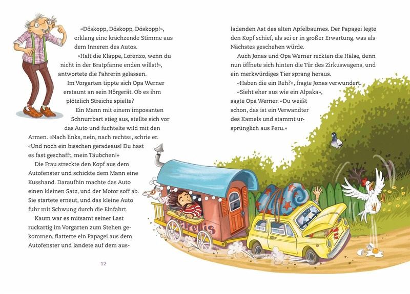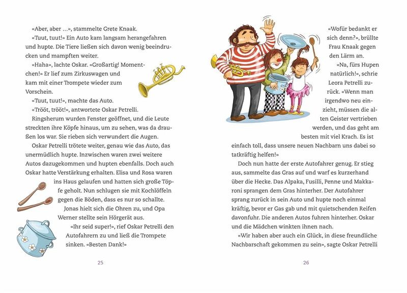 «Hände hoch, du Döskopp, oder es knallt!» Die neuen Nachbarn kündigen sich mit einigem Radau an! Erst knattert ein Zirkuswagen durch die kleine, gemütliche Wohnstraße, und ein bunter Papagei begrüßt alle lautstark mit frechen Sprüchen. Dann springt und rollt und hüpft eine lebhafte Familie heraus: Die Petrellis haben beschlossen, sesshaft zu werden! Jonas findet das toll und freundet sich schnell mit der gleichaltrigen Elisa an. Bei den Petrellis ist einfach immer etwas los! Zum Fensterputzen machen sie eine Pyramide, und den Grill zündet Oscar Petrelli als Feuerschlucker an. Aber nicht alle Nachbarn sind davon begeistert, schon gar nicht Frau Knaak, denn der fressen die Ziegen die Wäsche von der Leine, und überall liegt Alpaka-Mist herum! Zu allem Überfluss zapft Oscar Petrelli auch noch den Strom an, und es gibt einen gewaltigen Kurzschluss in der ganzen Straße! Ob die Petrellis es dennoch schaffen, die Nachbarn für sich zu gewinnen?