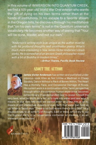 In this volume of IMMERSION INTO QUANTUM CREEK, we find a 105-year-old World War One veteran who wants the gift of dying on his own terms rather than at the hands of institutions. In his escape to a favorite stream in the Oregon hills, he discovers through his meditations that "on his own terms" is not in the Quantum universe's vocabulary. He becomes another way of seeing that "Your will be done, Master, and not our own."