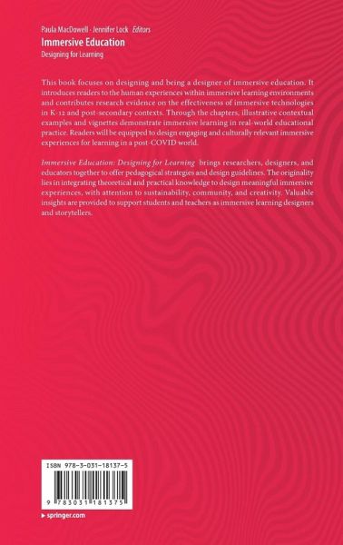 This book focuses on designing and being a designer of immersive education. It introduces readers to the human experiences within immersive learning environments and contributes research evidence on the effectiveness of immersive technologies in K-12 and post-secondary contexts. Through the chapters, illustrative contextual examples and vignettes demonstrate immersive learning in real-world educational practice. Readers will be equipped to design engaging and culturally relevant immersive experiences for learning in a post-COVID world. Immersive Education: Designing for Learning brings researchers, designers, and educators together to offer pedagogical strategies and design guidelines. The originality lies in integrating theoretical and practical knowledge to design meaningful immersive experiences, with attention to sustainability, community, and creativity. Valuable insights are provided to support students and teachers as immersive learning designers and storytellers.