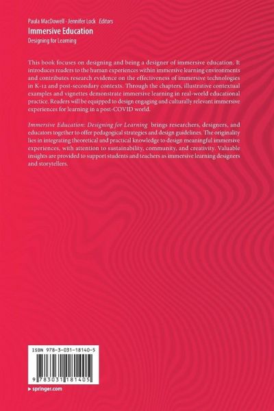 This book focuses on designing and being a designer of immersive education. It introduces readers to the human experiences within immersive learning environments and contributes research evidence on the effectiveness of immersive technologies in K-12 and post-secondary contexts. Through the chapters, illustrative contextual examples and vignettes demonstrate immersive learning in real-world educational practice. Readers will be equipped to design engaging and culturally relevant immersive experiences for learning in a post-COVID world. Immersive Education: Designing for Learning brings researchers, designers, and educators together to offer pedagogical strategies and design guidelines. The originality lies in integrating theoretical and practical knowledge to design meaningful immersive experiences, with attention to sustainability, community, and creativity. Valuable insights are provided to support students and teachers as immersive learning designers and storytellers.