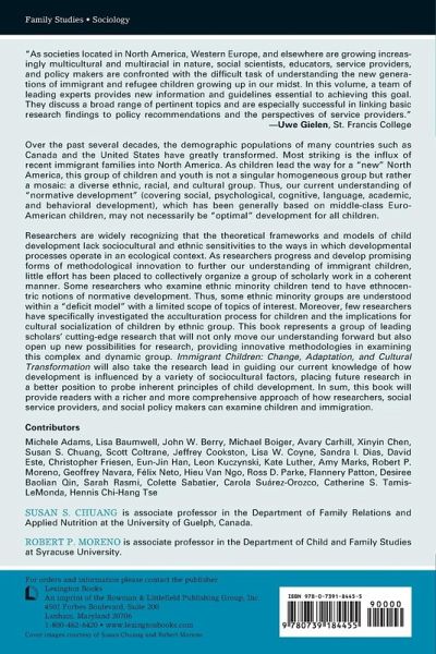 Over the past several decades, the demographic populations of many countries such as Canada as well as the United States have greatly transformed. Most striking is the influx of recent immigrant families into North America. As children lead the way for a "new" North America, this group of children and youth is not a singular homogenous group but rather, a mosaic and diverse ethnic, racial, and cultural group. Thus, our current understanding of "normative development" (covering social, psychological, cognitive, language, academic, and behavioral development), which has been generally based on middle-class Euro-American children, may not necessarily be "optimal" development for all children. Researchers are widely recognizing that the theoretical frameworks and models of child development lack the sociocultural and ethnic sensitivities to the ways in which developmental processes operate in an ecological context. As researchers progress and develop promising forms of methodological innovation to further our understanding of immigrant children, little effort has been placed to collectively organize a group of scholarly work in a coherent manner. Some researchers who examine ethnic minority children tended to have ethnocentric notions of normative development. Thus, some ethnic minority groups are understood within a "deficit model" with a limited scope of topics of interest. Moreover, few researchers have specifically investigated the acculturation process for children and the implications for cultural socialization of children by ethnic group. This book represents a group of leading scholars' cutting-edge research which will not only move our understanding forward but also to open up new possibilities for research, providing innovative methodologies in examining this complex and dynamic group. Immigrant Children: Change, Adaptation, and Cultural Transformation will also take the research lead in guiding our current knowledge of how development is influenced by a variety of sociocultural factors, placing future research in a better position to probe inherent principles of child development. In sum, this book will provide readers with a richer and more comprehensive approach of how researchers, social service providers, and social policymakers can examine children and immigration.