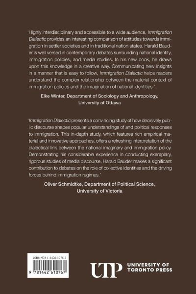 Immigration is an integral part of national identity in settler societies such as Canada. But in countries where identity is defined more in ethnic terms, such as Germany, the presence of immigrants has only recently begun to be acknowledged. Taking these two countries as case studies, Immigration Dialectic explores the impact of immigration on national identity as imagined through media-based discourse. Harald Bauder argues that while both countries rely on negative depictions of immigrants to construct a positive image of the self, the ways in which Canada and Germany construct national identity in relation to representations of immigrants are significantly different. Bauder introduces a sophisticated framework of Hegelian dialectics for the growing interdisciplinary literature regarding media perspectives on immigration and national identity. Providing close analysis of themes such as belonging, economic impacts, and national security, Immigration Dialectic will appeal to anyone interested in contemporary discussions on immigration.