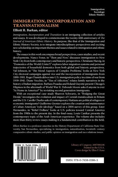 Immigration, Incorporation and Transnationalism is an intriguing collection of articles and essays. It was developed to commemorate the twenty-fifth anniversary of The Journal of American Ethnic History. Its purpose, like that of the Immigration and Ethnic History Society, is to integrate interdisciplinary perspectives and exciting new scholarship on important themes and issues related to immigration and ethnic history.The essays in this work encompass broad perspectives, cases studies, and recent developments. Nancy Foner, in "Then and Now," discusses immigration to New York City from both contemporary and historic perspectives. Christiane Harzig, in "Domestics of the World (Unite?)" explores labor migration systems and personal trajectories of household domestics from both global and historic perspectives. Val Johnson, in "The Moral Aspects of Complex Problems," looks at New York City electoral campaigns against vice and the incorporation of immigrants from 1890-1901. Roger Daniels delves into U.S. immigration policy in a time of war from 1939-1945. Diane Vecchio, in "Ties of Affection," relates family narratives in the history of Italian migration. Barbara Posadas and Roland Guyotte present Chicago's Filipinos in the aftermath of World War II. Deborah Moore asks if anyone is ever "At Home in America?" by revisiting second generation immigrants.With an exceptional case study Sharron Schwartz, in "Bridging the Great Divide," investigates the evolution and impact of Cornish translocalism in Britain and the U.S. Carolle Charles asks if contemporary Haitians are political refugees or economic immigrants? Guillermo Grenier explores the creation and maintenance of Cuban American "exile ideology" based on a 2004 survey of this group. Ester Hernandez, in "Relief Dollars," looks at U.S. policies toward Central America from the 1980s to the present day. In the final essay, Louis Canikar presents the contemporary topic of the Arab American experience. The volume also includes more than thirty review essays making it a fundamental contribution to the field.
