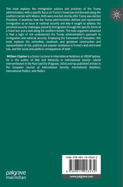 This book explores the immigration policies and practices of the Trump administration, with a specific focus on Trump's travel ban and the wall along the southern border with Mexico. Both were enacted shortly after Trump was elected President. It examines how the Trump administration defined and represented immigration as an issue of national security and why it sought to address the perceived security challenges posed by immigration through the specific forms of a travel ban and a wall along the southern border. The main argument advanced is that a logic of risk underpinned the Trump administration's approach to immigration and national security. Employing the framework of riskisation, this book explores the embodied, racialised, and gendered construction and representation of risk, political and popular resistance to Trump's wall and travel ban, and the social and political consequences of both.