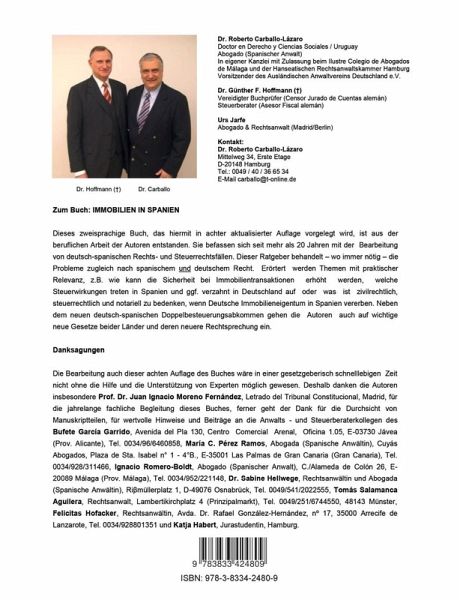 "Immobilien in Spanien" ist aus der beruflichen Arbeit der Autoren entstanden, die sich seit mehr als zwei Jahrzehnten mit der Bearbeitung deutsch-spanischer Rechts- und Steuerfälle befassen. Ein Schwerpunkt ihrer Tätigkeit liegt im Bereich privater und geschäftlicher Immobilieninvestitionen in Spanien. Das Buch ist aus ihrer Beratungspraxis zu typischen und häufig wiederkehrenden Fragen entstanden: Welche Transaktionen können wie aus Deutschland heraus vorgenommen werden? Welche Verwaltungs-, Versicherungs- und Steuerpflichten treffen einen Eigentümer? Was ist beim Verkauf zu beachten? Wie werden Transaktionen besteuert? Wie ist ein Erbfall zu planen und abzuwickeln? - Der vorliegende Ratgeber soll überblicksweise alle Fragen beantworten, die sich in den einzelnen Phasen einer Immobilieninvestition in Spanien stellen. Das Buch richtet sich hauptsächlich an nicht in Spanien ansässige Immobilieneigentümer, die an einer sachgerechten Vorbereitung und Durchführung ihrer Investition von Deutschland aus interessiert sind. Gleichwohl wird auch die Situation einer steuerlichen Ansässigkeit in Spanien gebührend berücksichtigt. Die Probleme werden - wo immer nötig - nach spanischem und deutschem Recht behandelt. Zugleich wird auf die wesentlichen Unterschiede zwischen beiden Rechtsordnungen hingewiesen. Der bewährte und zweisprachige Ratgeber "Immobilien in Spanien" wird hiermit in neunter und aktualisierter Auflage vorgelegt.