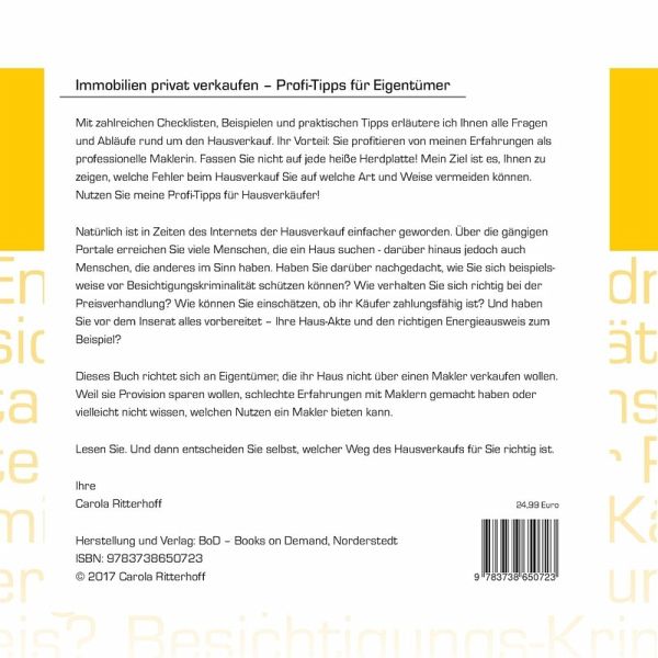 Mit zahlreichen Checklisten, Beispielen und praktischen Tipps erläutere ich Ihnen alle Fragen und Abläufe rund um den Hausverkauf. Ihr Vorteil: Sie profitieren von meinen Erfahrungen als professionelle Maklerin. Fassen Sie nicht auf jede heiße Herdplatte! Mein Ziel ist es, Ihnen zu zeigen, welche Fehler beim Hausverkauf Sie auf welche Art und Weise vermeiden können. Nutzen Sie meine Profi-Tipps für Hausverkäufer!Natürlich ist in Zeiten des Internets der Hausverkauf einfacher geworden. Über die gängigen Portale erreichen Sie viele Menschen, die ein Haus suchen. Darüber hinaus jedoch auch Menschen, die anderes im Sinn haben. Haben Sie darüber nachgedacht, wie Sie sich beispielsweise vor Besichtigungskriminalität schützen können? Wie verhalten Sie sich richtig bei der Preisverhandlung? Wie können Sie einschätzen, ob ihr Käufer zahlungsfähig ist? Und haben Sie vor dem Inserat alles vorbereitet? Ihre Haus-Akte und den richtigen Energieausweis zum Beispiel? Dieses Buch richtet sich an Eigentümer, die ihr Haus nicht über einen Makler verkaufen wollen. Weil sie Provision sparen wollen, schlechte Erfahrungen mit Maklern gemacht haben oder vielleicht nicht wissen, welchen Nutzen ein Makler bieten kann.Lesen Sie. Und dann entscheiden Sie selbst, welcher Weg des Hausverkaufs für Sie richtig ist.Ihre Carola Ritterhoff