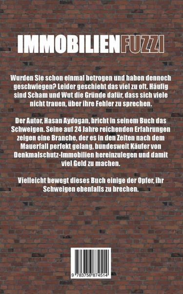 Wurden Sie schon einmal betrogen und haben dennochgeschwiegen? Leider geschieht das viel zu oft. Häufigsind Scham und Wut die Gründe dafür, dass sich viele nicht trauen, über ihre Fehler zu sprechen.Der Autor, Hasan Aydogan, bricht in seinem Buch dasSchweigen. Seine auf 24 Jahre reichenden Erfahrungenzeigen eine Branche, der es in den Zeiten nach demMauerfall perfekt gelang, bundesweit Käufer vonDenkmalschutz-Immobilien hereinzulegen und damitviel Geld zu machen.Vielleicht bewegt dieses Buch einige der Opfer, ihrSchweigen ebenfalls zu brechen.