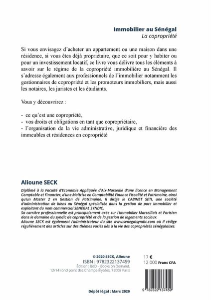 Si vous envisagez d'acheter un appartement ou une maison dans une résidence, si vous êtes déjà propriétaire, que ce soit pour y habiter ou pour un investissement locatif, ce livre vous délivre tous les éléments à savoir sur le régime de la copropriété immobilière au Sénégal. Il s'adresse également aux professionnels de l'immobilier notamment les gestionnaires de copropriété et les promoteurs immobiliers, mais aussi les notaires, les juristes et les étudiants.