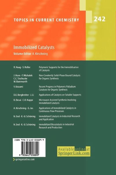 Journal of the American Chemical Society, 127/2005: This volume contains eight chapters, written by leading experts in their fields, that cover a variety of different aspects of immobilized catalysts. Although it would be impossible for this book to be fully comprehensive, the authors have done an excellent job of covering the most recent key developments in the field. Topics covered include polymeric supports, noncovalently bound catalysts, immobilized palladium catalysts for organic synthesis, applications of catalysts on soluble supports, microwave-assisted synthesis, continuous flow processes, industrial applications, and immobilized biocatalysts in industrial research and production. This will prove to be a valuable reference work for those already involved in the field and also for those contemplating entering it. It should be on the shelves of every good chemistry library.