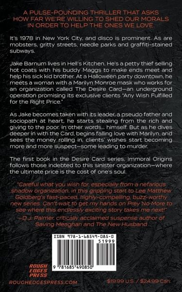 It's 1978 in New York City, and disco is prominent. As are mobsters, gritty streets, needle parks and graffiti-stained subways. Jake Barnum lives in Hell's Kitchen. He's a petty thief selling hot coats with his buddy Maggs to make ends meet and help his sick kid brother. At a Halloween party downtown, he meets a woman with a Marilyn Monroe mask who works for an organization called The Desire Card-an underground operation promising its exclusive clients "Any Wish Fulfilled for the Right Price." As Jake becomes taken with its leader, a pseudo father and sociopath at heart, he starts stealing from the rich and giving to the poor. In other words...himself. But as he dives deeper in with the Card, begins falling love with Marilyn, and sees the money rolling in, clients' wishes start becoming more and more suspect-some leading to murder.