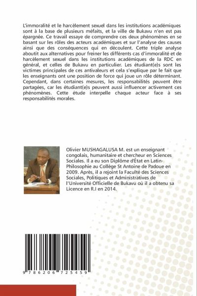 L'immoralité et le harcèlement sexuel dans les institutions académiques sont à la base de plusieurs méfaits, et la ville de Bukavu n'en est pas épargnée. Ce travail essaye de comprendre ces deux phénomènes en se basant sur les rôles des acteurs académiques et sur l'analyse des causes ainsi que des conséquences qui en découlent. Cette triple analyse aboutit aux alternatives pour freiner les différents cas d'immoralité et de harcèlement sexuel dans les institutions académiques de la RDC en général, et celles de Bukavu en particulier. Les étudiant(e)s sont les victimes principales de ces antivaleurs et cela s'explique par le fait que les enseignants ont une position de force qui joue un rôle déterminant. Cependant, dans certaines mesures, les responsabilités peuvent être partagées, car les étudiant(e)s peuvent aussi influencer activement ces phénomènes. Cette étude interpelle chaque acteur face à ses responsabilités morales.