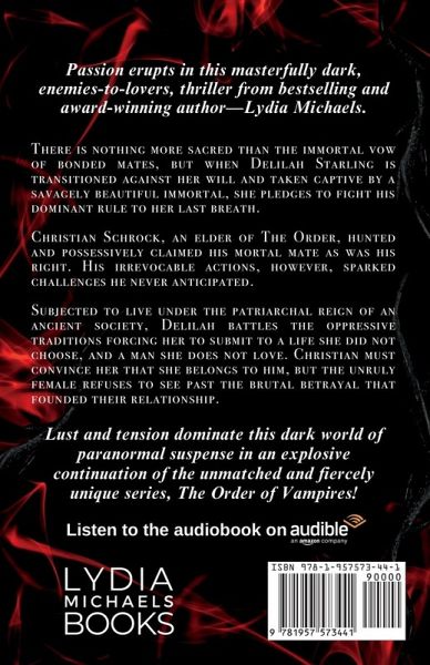 Passion erupts in this masterfully dark, enemies-to-lovers, thriller from bestselling and award-winning author-Lydia Michaels. There is nothing more sacred than the immortal vow of bonded mates, but when Delilah Starling is transitioned against her will and taken captive by a savagely beautiful immortal, she pledges to fight his dominant rule to her last breath. Christian Schrock, an elder of The Order, hunted and possessively claimed his mortal mate as was his right. His irrevocable actions, however, sparked challenges he never anticipated. Subjected to live under the patriarchal reign of an ancient society, Delilah battles the oppressive traditions forcing her to submit to a life she did not choose, and a man she does not love. Christian must convince her that she belongs to him, but the unruly female refuses to see past the brutal betrayal that founded their relationship. Lust and tension dominate this dark world of paranormal suspense in an explosive continuation of the unmatched and fiercely unique series, The Order of Vampires!