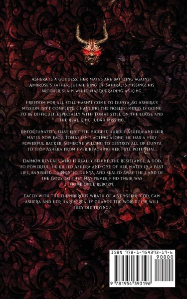 Ashera is a goddess. Her mates are battling against Ambrose's father. Judah, King of Sahira, is missing; his brother slain while masquerading as king. Freedom for all still hasn't come to Dunya, so Ashera's mission isn't complete. Changing the nobles' minds is going to be difficult, especially with Tomas still on the loose and the real King Judah missing. Unfortunately, that isn't the biggest hurdle Ashera and her mates now face. Tomas isn't acting alone; he has a very powerful backer. Someone willing to destroy all of Dunya to stop Ashera from ever reaching her full potential. Daimon reveals who is really behind the resistance. A god so powerful, he killed Ashera and one of her mates in a past life, banished Daimon to Dunya, and sealed away the Land of the Gods, so they may never find their way home once reborn. Faced with the thunderous wrath of a vengeful god, can Ashera and her harem really change the world? Or will they die trying?