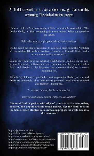 A citadel crowned in ice. An ancient message that contains a warning. The clash of ancient powers. Nahum thinks he's accompanying Olivia on a simple retrieval for The Orphic Guild, but finds something far more sinister. Relics connected to the Fallen. Relics that can send people mad and incite violence. But he hasn't the time or resources to deal with them now. The Nephilim are spread thin. JD needs an artefact to unlock the Emerald Tablet, and a team are sent to Egypt to steal it. Behind everything lurks the threat of Black Cronos. The hunt for the mysterious Comte de St Germain's base continues, and their research takes Barak and Estelle to the Pyrenees, and a remote citadel on a snowy mountain top. With the Nephilim tied up with their various pursuits, Harlan, Jackson, and Olivia are vulnerable. They think they're prepared-until they're attacked and Jackson is kidnapped. As events connect, the threat intensifies. Everyone must remain vigilant, or they will lose everything. Immortal Dusk is packed with edge of your seat excitement, twists, betrayal, and unputdownable urban fantasy. Get the sixth book in the White Haven Hunters series now, and prepare for a wild ride into the unknown.