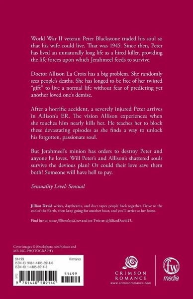 World War II veteran Peter Blackstone traded his soul so that his wife could live. That was 1945. Since then, Peter has lived an unnaturally long life as a hired killer, providing the life forces upon which Jerahmeel feeds to survive. Doctor Allison La Croix has a big problem. She randomly sees people's deaths. She has longed to be free of her twisted ""gift"" to live a normal life without fear of predicting yet another loved one's demise. After a horrific accident, a severely injured Peter arrives in Allison's ER. The vision Allison experiences when she touches him nearly kills her. He teaches her to block these devastating episodes as she finds a way to unlock his forgotten, passionate soul. But Jerahmeel's minion has orders to destroy Peter and anyone he loves. Will Peter's and Allison's shattered souls survive the devious plan? Or could their love save them both? Someone will have hell to pay. Sensuality Level: Sensual