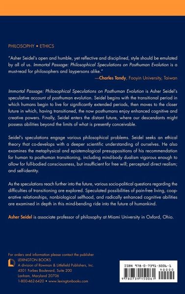 Immortal Passage: Philosophical Speculations on Posthuman Evolution defends the posthuman hypothesis: that descendants of present humans, leading lives of indefinitely extended duration, and having significantly altered biological, psychological, and social characteristics, will have lives superior to those of current humans. A detailed speculative account of these lives, with attention to philosophical issues raised by such an account, presents the major philosophical challenge of Immortal Passage.
