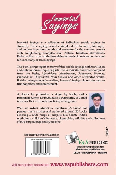 Our ancient texts are a virtual treasure-trove of wise sayings, and teachings on correct living. And this book is an attempt to draw on this inexhaustible wealth. Here is a collection of Subhashitas (noble sayings in Sanskrit). These sayings reveal a simple, down-to-earth philosophy and convey important morals for the common people with enlightening examples from Nature. Material has been drawn fom celebrated ancient thinkers and philosophers such as Kalidasa, Bhavabhuti, Kalhana, Bhartrihari and others. This book brings together many of their noble sayings with translation and elaboration in simple English. Material for the book has also been sourced from the Vedas, Upanishads, Mahabharata, Ramayana, Puranas, Panchatantra, Hitopadesha, Neeti Shataka and other celebrated works. Besides being enjoyable reading, the book shows the path to true happiness and contentment. Some Immortal Sayings: *The Sun is red at the time of rising, and red at the time of setting too. Similarly, noble peole remain same at the time of happiness or distress. *Mean-minded people discriminate between people as their own and others. For noble men, however, the whole world forms their family. *One must accept sorrow as one accepts happiness - for happiness and sorrow come rotating like a wheel. *People blinded by anger disregard those who have worked for them, hurt holy men and harm themselves. What more can they do? *Fie upon a man who lives without helping others. Hail the animals, for they serve even after their death, by their skin. *Mind wanders everywhere like an intoxicated elephant. Intelligence with God-like knowledge, stops the wandering of the mind and calms it down.