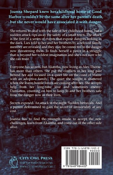 Joanna Shepard knew her childhood home of Good Harbor wouldn't be the same after her parent's death, but she never would have associated it with danger. She returns to deal with the sale of her childhood home, but a sudden attack rips away the safety of a small town. The attack is the first of a series of events that expose dangers lurking in the dark. Lies told to her and her brothers by a beloved family member are revealed and they may be connected to the danger now threatening them. Jo finds herself a pawn in a struggle that is beyond her wildest imagination and she's not sure who she can trust. Everyone has secrets, but Akantha, now living as Alex Thorne, has more than others. She put the conflicts in her long past behind her and focused on a quiet life on the coast of Maine with an adoptive family. The quiet she sought is shattered when she learns hostile forces are coming after her. She accepts help from her long-time love and sometimes enemy, Damianos, counting on him to keep Jo and her brothers safe from the danger now in their lives. Secrets exposed. An attack in the night. Sudden betrayals. And a person determined to gain the secret of immortality at any cost. Joanna has to find the strength inside to accept the new challenges, learn from Akantha, and come out of the other side alive.
