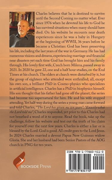 Charles believes that he is destined to survive until the Second Coming no matter what. Ever since 1976 when he devoted his life to God he has survived situations when many should have died. On his website he recounts near death experiences since he was a baby in Hungary at the beginning of WWII, 36 years before he became a Christian: God has been preserving his life, including the last years of the war in Germany. He has had numerous visions and dreams, experiencing marriage and financial near disasters yet each time God has brought him and his family through. His lovely first wife, Czech born Milena, passed away in 2021. In 2020 he gave 22, one and a half hour studies, on the End Times at his church. The elders at church were disturbed by it, but the group of eighteen who attended were enthralled; all, except his own son, a brilliant PhD in Cosmo-physics who specializes in artificial intelligence. Charles has a PhD in biophysics himself. His son thought that his father had gone off the planet; the series had become too supernatural for him. He and his wife stopped attending. Yet half-way during the series a young man came forward and told Charles, "The Lord has given me ten years". "Exactly what the Lord told me", Charles responded, yet prior to this Charles had not breathed a word of it to anyone. Read the book, take up the challenge, follow his website and test out the truth of his claim for yourself over the next few years. Charles is either a liar or is blessed by the Lord. God is good. All credit goes to the Lord Jesus. In 2024 Charles married a devout Papua New Guinean widow Gloria. She and her husband had been Senior Pastors of the AOG church in PNG for ten years.