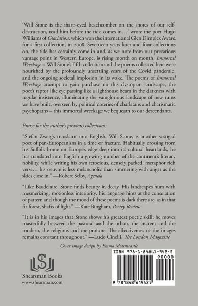 The poems of Immortal Wreckage attempt to gain purchase on our dystopia, the poet's eye passing like a lighthouse beam in the darkness, illuminating the landscape of immortal wreckage we bequeath to our descendants.