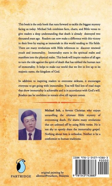 This book is the only book that runs forward to tackle the biggest mystery facing us today. Michael Soh combines facts, charts, and Bible verses to give readers a deep understanding that death is already destroyed two thousand years ago. Readers can now make a difference with this victory in their life by staying as immortals in this world tending to His fields. There are many revelation with Bible references to discover renew youth and immortality. Immortality start in the spiritual realm and manifest into the physical realm. This book inspire readers of all ages to turn the tide against the spirit of death that has robbed human race of immortality. It helps to make our world that we live in lives up to its majestic name, the kingdom of God. In addition to inspiring readers to overcome sickness, it encourages everyone to get going with immortality. You will find lots of road maps that show immortality is achievable and is in accordance with Gods will. Readers can be confident to remain alive till rapture comes.