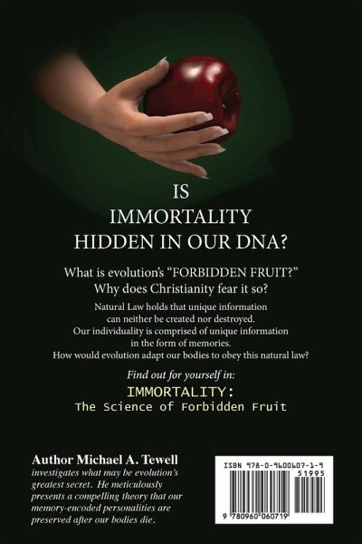 IS IMMORTALITY HIDDEN WITHIN OUR DNA? Lawyer-researcher Michael A. Tewell says "YES!" Our bodies die, but the law of information conservation states that information cannot be created or destroyed. If true, then is not our individuality the very expression of information we attain during our lifetime? How would evolution respond to a natural law that forbids the destruction of any information? Is not our individuality the child of this "unique information?" Like pieces of a puzzle, Michael A. Tewell uses scientific discoveries in human evolution, genetics, biophysics, neuroscience and quantum theory to build a theoretical model of what evolution may have created by adapting our genetic code to comply with the natural law of information conservation. But, be warned. Expect that what he has discovered will change your life! Part scientific mystery, part personal memoir, IMMORTALITY: The Science of Forbidden Fruit follows the author back in time to his youth; to explore how the author came to envision a life after death without the need for religious faith. How did a near-death-experience transform a shy, six-year-old, who dreamed of a simple life of Christian faith, into a fearless trial lawyer, defender of the poor-and a religious skeptic? Is evolutionary immortality the "Forbidden Fruit" of science that Christianity has feared for so long? Make your own decision with IMMORTALITY: The Science of Forbidden Fruit
