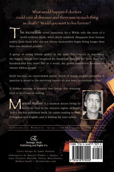 What would happen if doctors could cure all illnesses and there was no such thing as death? Would you want to live forever? The incredible novel Immortals for a While tells the story of a world without death, when death suddenly disappears from human reality. Even those who did not choose immortality begin living longer than they ever dreamed possible. A group of young friends gather in the early 21st century to experience the biggest change ever imagined for mankind: they live for more than two hundred fifty years! But as a result, the global population increases to twenty billion people. Earth becomes an overcrowded planet, bereft of young people's creativity. A question is posed to the surviving masses: do you want to continue living? A hidden message is revealed that brings this stunning story to its climactic ending. Manoel Walber is a medical doctor living in Belém do Pará in the Amazon region of Brazil. This is his first published book. He enjoys reading in both Portuguese and English, and is writing his next novels.