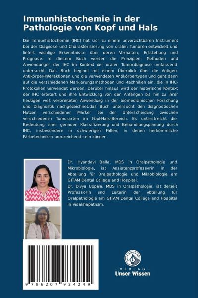 Die Immunhistochemie (IHC) hat sich zu einem unverzichtbaren Instrument bei der Diagnose und Charakterisierung von oralen Tumoren entwickelt und liefert wichtige Erkenntnisse über deren Verhalten, Entstehung und Prognose. In diesem Buch werden die Prinzipien, Methoden und Anwendungen der IHC im Kontext der oralen Tumordiagnose umfassend untersucht. Das Buch beginnt mit einem Überblick über die Antigen-Antikörper-Interaktionen und die verwendeten Antikörpertypen und geht dann auf die verschiedenen Markierungsmethoden und -techniken ein, die in IHC-Protokollen verwendet werden. Darüber hinaus wird der historische Kontext der IHC erörtert und ihre Entwicklung von den Anfängen bis hin zu ihrer heutigen weit verbreiteten Anwendung in der biomedizinischen Forschung und Diagnostik nachgezeichnet.das Buch untersucht den diagnostischen Nutzen verschiedener Marker bei der Unterscheidung zwischen verschiedenen Tumorarten im Kopf-Hals-Bereich. Es unterstreicht die Bedeutung einer genauen Klassifizierung und Behandlungsplanung durch IHC, insbesondere in schwierigen Fällen, in denen herkömmliche Färbetechniken unzureichend sein können.