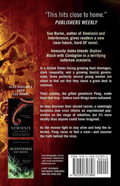 Sue Burke, author of Semiosis and Interference, gives readers a new near-future, hard sf novel. Immunity Index blends Orphan Black with Contagion in a terrifying outbreak scenario. Bustle's 40 Best New Books May 2021 Amazon Best of the Month May 2021 In a US facing growing food shortages, stark inequality, and a growing fascist government, three perfectly normal young women are about to find out that they share a great deal in common. Their creator, the gifted geneticist Peng, made them that way-before such things were outlawed. Rumors of a virus make their way through an unprotected population on the verge of rebellion, only to have it turn deadly. As the women fight to stay alive and help, Peng races to find a cure-and the cover up behind the virus. Other Books by Sue Burke Semiosis duology Semiosis Interference Immunity Index Dual Memory