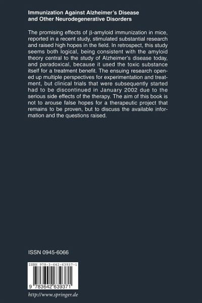 Promising effects in mice of immunization by ß-amyloid stimulated substantial research efforts and high hopes. In retrospect, this study appears simultaneously logical, consistent as it is with the amyloid theory central today in the field of Alzheimer's disease studies, and paradoxical, because it involved using the toxic substance itself for a treatment benefit. The research thus begun opens up multiple perspectives for experimentation and for treatment. Clinical trials began, but had to be stopped in January 2002 because of serious side effects. The editors' objective for this book is not to arouse false hopes for a therapeutic project that must still be proven, but to discuss the available information and the questions it raises.