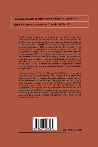 The hybridoma technique for producing monoclonal antibodies developed by Drs. Kohler and Millstein in 1975 revolutionized the field of tumor immunology. It is now clear that there are antigens associated with or restricted to human neoplasms that have biologic significance. Monoclonal antibodies have already been demonstrated to have great immunodiagnostic value, and it is anticipated that they will become a component of our therapeutic armamentarium. Most investigators in the field, however, feel the true potential of monoclonal antibodies in cancer therapy remains to be determined. Clearly the most encouraging results have been witnessed in the treatment of hematologic malignancies. This volume of Cancer Treatment and Research explores the current state of the art of immunoconjugate therapy of hematologic malignancies. The first chapter, authored by Drs. Rosen and Kuzel, reviews the current status of radioimmunotherapy of lymphoma. Results of clinical investigations utilizing radiolabeled immunoconjugates in B-cell lymphomas, T-cell lym phomas, and Hodgkin's disease are discussed. In addition, obstacles to effective antibody therapy are highlighted and toxicities are summarized. Chapter 2, written by Drs. Sgouros and Scheinberg, critiques the treat ment of leukemia with radiolabeled monoclonal antibodies. In this chapter, the unique features of leukemia that make it particularly suitable for radio immunotherapy are discussed, an overview of selected clinical trials is presented, and a treatment planning approach to radioimmunotherapy in corporating biologic and physical parameters is reviewed.