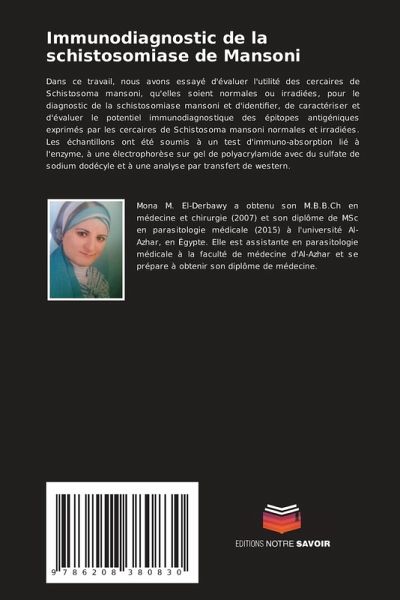 Dans ce travail, nous avons essayé d'évaluer l'utilité des cercaires de Schistosoma mansoni, qu'elles soient normales ou irradiées, pour le diagnostic de la schistosomiase mansoni et d'identifier, de caractériser et d'évaluer le potentiel immunodiagnostique des épitopes antigéniques exprimés par les cercaires de Schistosoma mansoni normales et irradiées. Les échantillons ont été soumis à un test d'immuno-absorption lié à l'enzyme, à une électrophorèse sur gel de polyacrylamide avec du sulfate de sodium dodécyle et à une analyse par transfert de western.