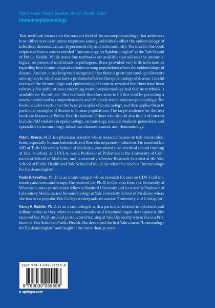 Peter J. Krause, M.D. is a physician-scientist whose research focuses on tick-borne infections, especially human babesiosis, Borrelia miyamotoi infection, and Lyme disease. He received his MD at Tufts University School of Medicine, completed post-medical school training at Yale, Stanford, and UCLA, was a Professor of Pediatrics at the University of Connecticut School of Medicine, and is currently a Senior Research Scientist at the Yale School of Public Health and Yale School of Medicine where he teaches "Immunology for Epidemiologists". Paula B. Kavathas, Ph.D. is an immunologist whose research focuses on CD8 T cell immunity and immunotherapy. She received her Ph.D. in Genetics from the University of Wisconsin, was a postdoctoral fellow at Stanford University and is currently Professor of Laboratory Medicine and Immunobiology at Yale University School of Medicine where she teaches a popular Yale College undergraduate course "Immunity and Contagion". Nancy H. Ruddle, Ph.D. is an immunologist with a particular interest in cytokines and inflammation as they relate to autoimmunity and lymphoid organ development. She received her Ph.D. and did postdoctoral training at Yale University where she is a Professor at Yale School of Public Health. She developed the first Yale course , "Immunology for Epidemiologists" and taught it for more than 35 years.